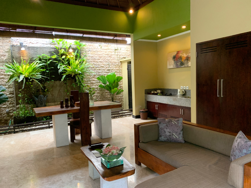 The villa features an open airy living room and our most spacious bathroom.